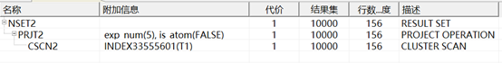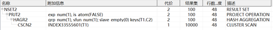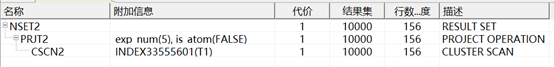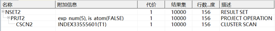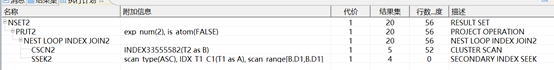 说明:CSCN2是CLUSTER INDEX SCAN的缩写即通过聚集索引扫描全表,全表扫描是最简单的查询,如果没有选择谓词,或者没有索引可以利用,则系统一般只能做全表扫描。在一个高并发的系统中应尽量避免全表扫描。