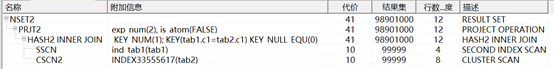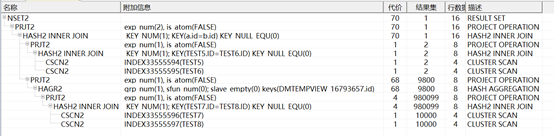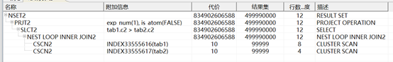 拿上面第三个计划节点举例:操作符是CSCN2即全表扫描,代价估算是0ms,扫描的记录行数是1711行,输出字节数是396个。